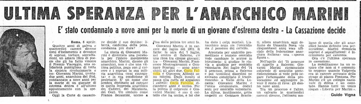 Poco dopo l'omicidio e la confessione di Marino, Soccorso Rosso Militante organizzò una campagna tesa a dimostrare l'innocenza di Marini e nel 1974, nel corso del processo, pubblicò un pamphlet intitolato "Il caso Marini" nel quale si illustrava una posizione di difesa nei confronti dell'anarchico. Parteciparono alla stesura del documento Pio Baldelli, Lanfranco Binni, Marco Boato, Sandro Canestrini, Dario Fo, Giambattista Lazagna, Roberto Matta, Franca Rame, Giulio Savelli, Giuliano Spazzali e Pietro Valpreda. Soccorso Rosso propose una ricostruzione dei fatti in cui Falvella e Alfinito, oltre ad essere accompagnati da un'altra decina di fascisti, sarebbero stati anche armati di coltello.