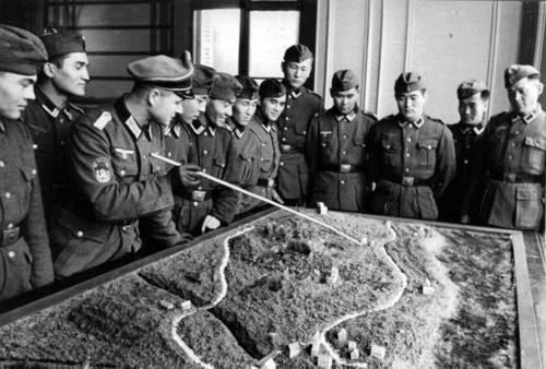 Ufficiali della Turkestan a rapportoFu tra l'ottobre e il novembre del 1941 che si formarono le prime unità combattenti di volontari turco-tatari e caucasici. Presso la Sicherungsdivision 444 si costituì un reggimento turco-tataro che sarebbe entrato in azione successivamente, tra la foce del Dnjepr e la Crimea, come Türk-Bataillon 444. Un altro gruppo di soldati dell'Armata Rossa originari dell'Asia centrale, dopo essere passato coi Tedeschi, diede vita a quell'unità che nel 1942 sarebbe diventata l'Infanteriebataillon 450, specializzato nell'attività antipartigiana. Nel campo di concentramento di Neuhammer, in Slesia, si formò invece il Sonderverband Bergmann, nel quale confluivano sia elementi musulmani (una compagnia azera e nordcaucasica) sia elementi cristiani (tre compagnie georgiane, un plotone armeno). In seguito a due successive azioni sul fronte caucasico (estate 1942 e gennaio 1943), la Bergmann incrementerà i propri effettivi grazie all'afflusso di nuovi volontari, sicché l'unità dovrà essere riorganizzata in tre battaglioni: uno georgiano, uno azero e uno nordcaucasico. Il primo e il terzo verranno trasferiti in Grecia, mentre gli Azeri andranno a fronteggiare l'insurrezione di Varsavia nell'agosto 1944. Infine, vi furono reparti di vario genere, tra i quali la Brigata Roller (20.000 uomini, per lo più türkmeni), la Divisione Montanari del Caucaso (7.000 uomini), una decina di battaglioni, oltre duecento compagnie autonome dislocate nelle retrovie, reparti d'autodifesa dei villaggi caucasici.