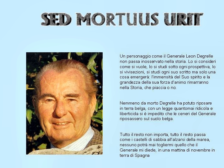 Ritratto Leon Degrelle in esilio (Click immagine)Sono passati decenni dal mio primo incontro con il Generale, ma sembra che sia stato ieri, le emozioni ed i ricordi sono vividi e presenti, quasi indelebili nella memoria, no sbaglio, nelle emozioni e nell'enorme Onore che mi è stato concesso di poter essere accolto in casa Sua. Il mio Onore si Chiama Fedeltà mon Chef