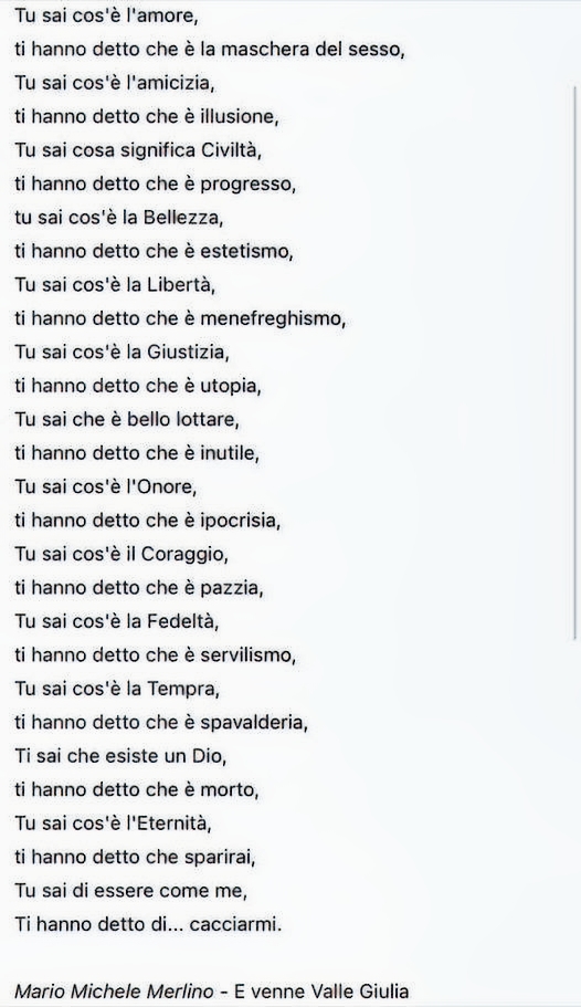 Cavaliere (Clik immagine)Mi chiedo sempre perchè sono quello che sono, perchè il bisogno di essere differente è così impellente da togliermi il fiato. In questa bellissima poesia Mario Merlino, con una incredibile lucidità da le uniche risposte possibili.