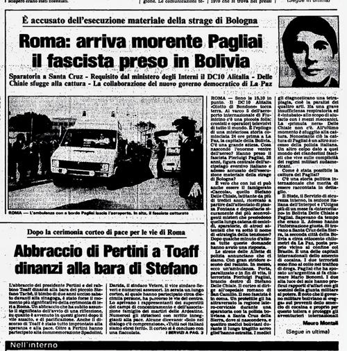 Pierluigi Pagliai (Clik immagine)Il 05/10/1982 le autorità italiane chiedono alla giunta militare al potere in Bolivia l'estradizione di Pagliai e di Delle Chiaie. Pagliai era stato localizzato a Santa Cruz. Il 10 Ottobre verso le 10.30/11 davanti alla Chiesa "Nuestra Signora de Fatima" viene intercettata l'automobile con Pierluigi da parte di agenti di sicurezza italiani arrivati proprio in quel giorno e affiancati da uomini dei servizi boliviani coadiuvati (pare) da agenti statunitensi.
